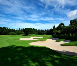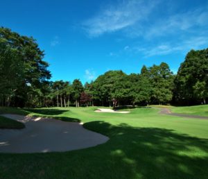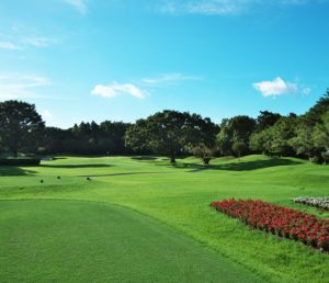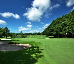 コースの特徴   高低差7mと殆ど平坦な地形に庭園をテーマに作られただけに四季折々の花が咲き乱れるフラットなコース。しかし、巧妙に配されたバンカーがきいていて狙い所が絞られている。しかもドッグレッグではコーナーに大きな池が横たわり、各々の飛距離によって狙う方向が違う楽しみがある。グリーンも大きく微妙なアンジュレーションがあってショートパットも気が抜けない。漫然と攻めはスコアにならない戦略的コースといえる。スタートテラス前に240yのドライビングレンジ・バンカーショット・アプローチ練習場があり利用しやすい。